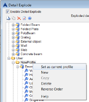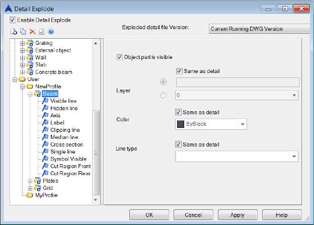 While exploding the detail, for each object / sub-object a corresponding setting will be searched in the "Current Profile". If there is no setting, the explode settings will be used from Advance Steel category.