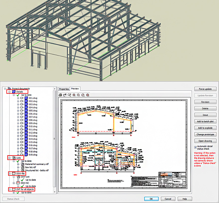 The derived documents are: details, BOM lists, NC, DStV and DXF files.