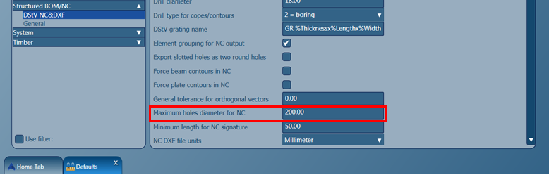 In our example, this default is set to 200, which means that if the size of the hole diameter is less than 200, the hole will be described in a BO Block (for holes), and if the hole diameter is exceeding 200 the hole will be described in a IK Block (for circular cut). As a result, for the beam having a hole diameter 40 on its web, you will get such NC-DStV file content: