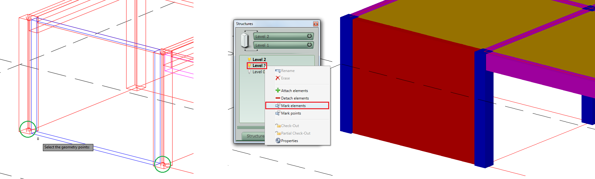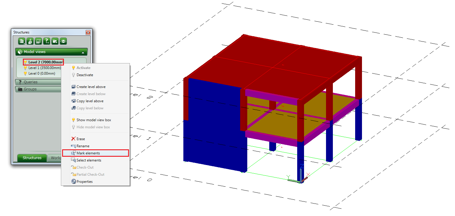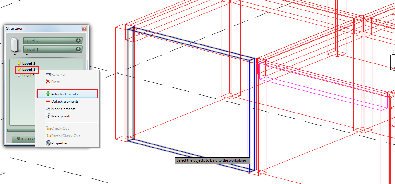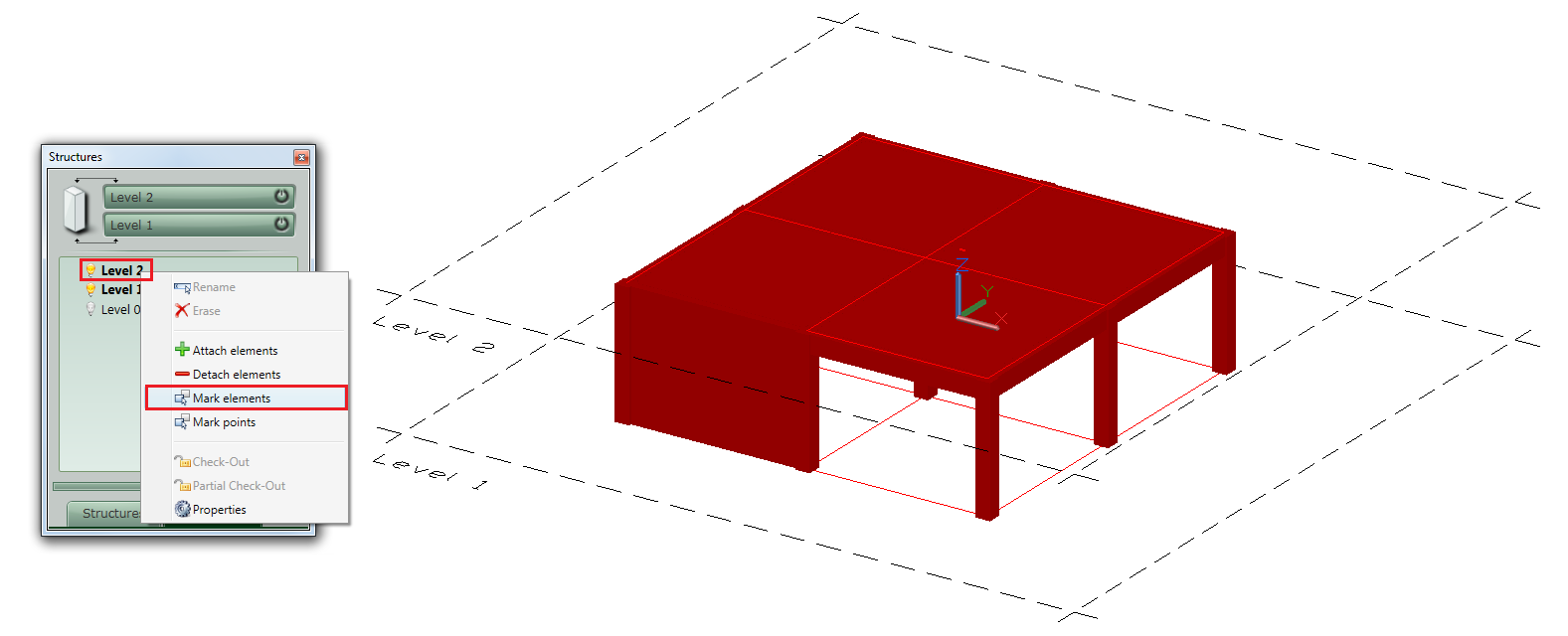 To see the elements that are attached to a level, right click on the level and select Mark elements. The elements that are attached to the level are highlighted.