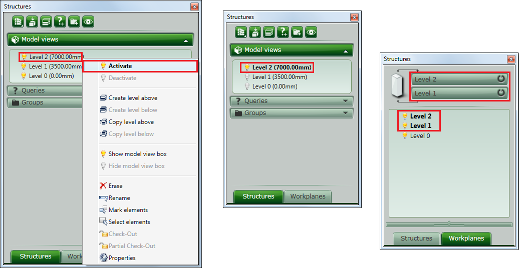If a level is activated, the new model elements will be created on the workplane(s) of the activated level.