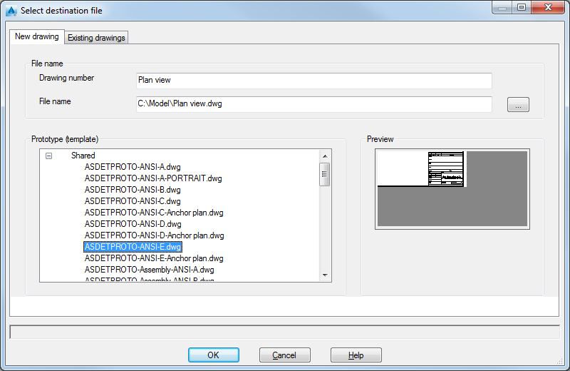 Select destination file window appears. Name your drawing, choose a Prototype and click