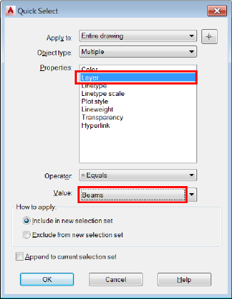 - In the Quick Select dialog box, make the following settings for the layer name: