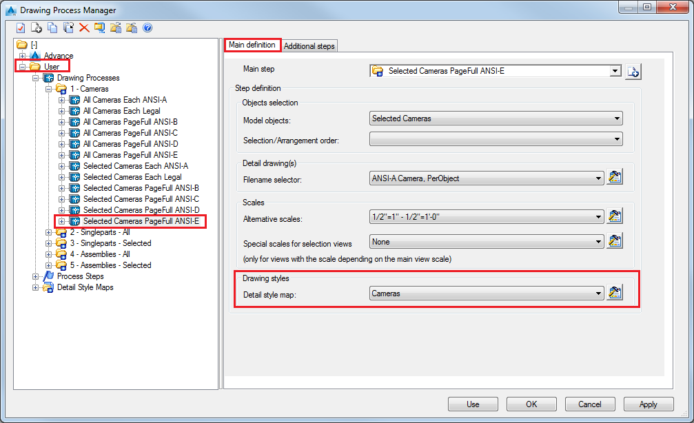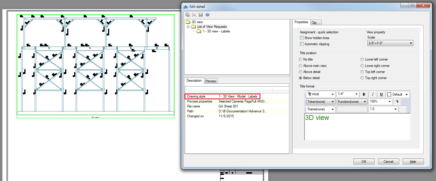 Your detail is created using the drawing style set in the Camera dialog (3D View - Model - Labels) and not the one present in the process detail map (Elevation View - Line).