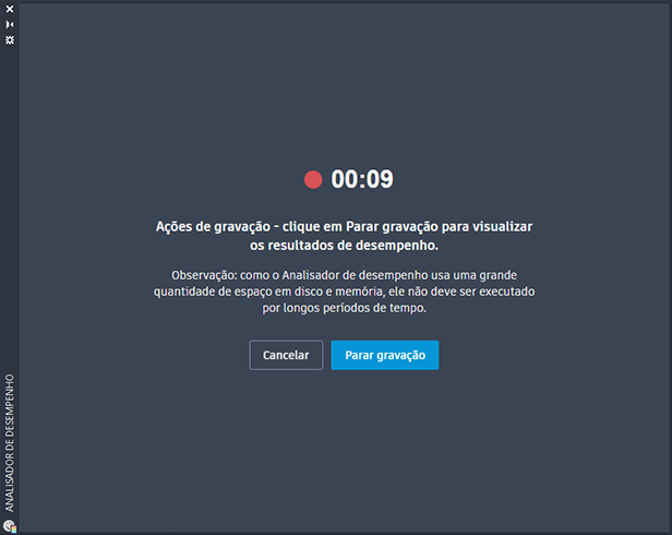 Abre a paleta do Analisador de desempenho, na qual é possível diagnosticar operações no AutoCAD que parecem lentas ou sem resposta.