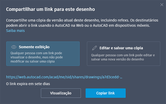 Qualquer pessoa com o link pode acessar o desenho em um navegador da Web ou no aplicativo móvel. O link expira sete dias após ser criado. É possível escolher entre dois níveis de permissão para os destinatários: Somente visualização e Editar e salvar uma cópia.