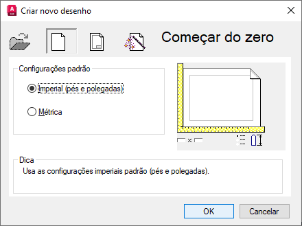 Start from Scratch cria um novo desenho com as configurações padrão imperial ou métrica. Use a Template cria um novo desenho com as configurações definidas em um template de desenho selecionado. Use a Wizard cria um novo desenho com as configurações especificadas no assistente Quick ou Advanced. (A primeira opção, Abrir um desenho, não fica disponível a partir do comando NOVO. Para abrir um desenho existente, utilize ABRIR.)