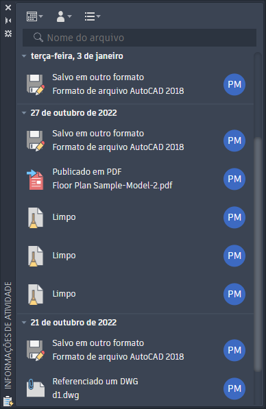 Exibe a paleta Informações de atividade para visualizar os eventos do desenho atual. Os eventos podem ser filtrados usando os filtros de calendário, usuário, evento ou pesquisa.
