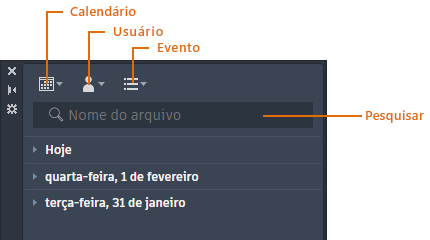A pesquisa filtra os eventos associados ao arquivo de desenho atual por caminho e nome de arquivo. A pesquisa pode ser usada sozinha ou em combinação com os filtros de calendário, usuário e evento.
