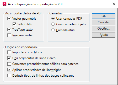 Define as opções para a importação de geometria, preenchimentos, imagens de raster e objetos de texto TrueType a partir de um arquivo PDF especificado.
