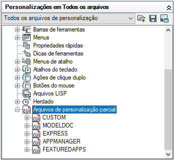 O painel Personalizações em é usado para navegar pelos diferentes elementos da interface do usuário que estão nos arquivos de personalização carregados.