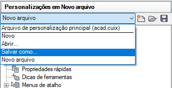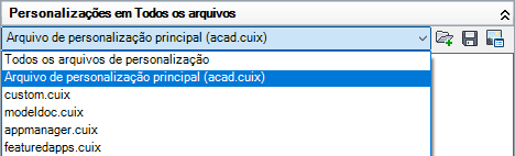 Todos os novos comandos criados são adicionados diretamente no arquivo CUIx de trabalho. Se o arquivo CUIx em que deseja trabalhar não está carregado, selecione Abrir a partir da lista suspensa Arquivos de personalização. A seguir, procure e selecione o arquivo CUIx com o qual deseja trabalhar.