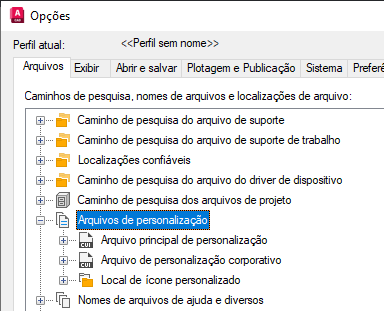 - Na caixa de diálogo Opções, guia Arquivos, clique no sinal de mais (+) ao lado de Arquivos de personalização, para expandir o nó.