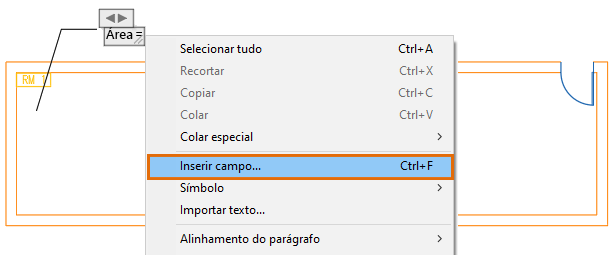 O perímetro de RM 2 é contornado com uma polilinha aberta. Quando solicitado a selecionar o objeto na caixa de diálogo Campo, clique na polilinha que forma as partes inferior e laterais do ambiente. A linha superior não é uma polilinha fechada para o ambiente. Uma boa prática é verificar a visualização do valor calculado na caixa de diálogo Campo.