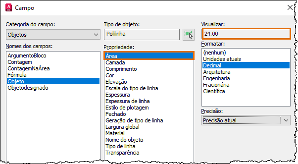 As propriedades do objeto selecionado, incluindo a área, são exibidas.
