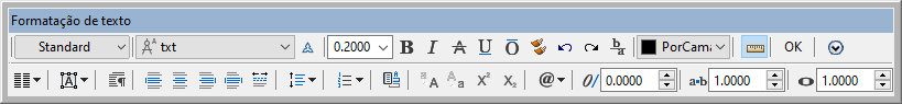 A barra de ferramentas Formatação de texto é exibida sempre que você cria ou edita um objeto TextoM. Essa barra de ferramentas não está disponível para texto de linha única.
