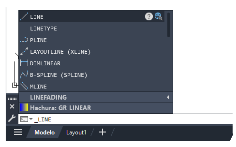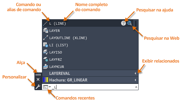 Quando você começa a digitar, a letra L neste exemplo, os comandos e as variáveis de sistema disponíveis são exibidos em uma lista. Chamamos isso de lista de Preenchimento automático. Em seguida, é possível escolher o comando ou a variável de sistema que você deseja usar.