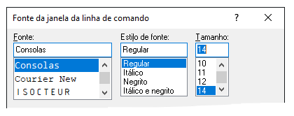 Na caixa de diálogo Fonte da janela da linha de comando, altere a fonte, o estilo de fonte e as opções de tamanho do texto exibido nas janelas Comando e Texto.