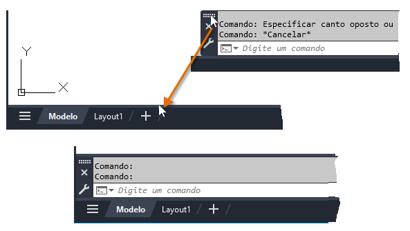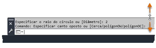 Encaixar a janela de comando – Clique e mantenha pressionado o botão do mouse sobre a alça na borda esquerda da janela de comando e arraste a janela para uma nova localização na borda superior ou inferior da janela de desenho. Solte o botão do mouse quando a janela de comando chegar no ponto desejado.