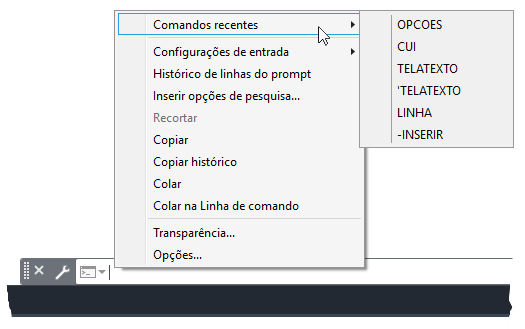Como alternativa, é possível clicar com o botão direito do mouse na janela de comando e escolher um comando no submenu Comandos recentes.