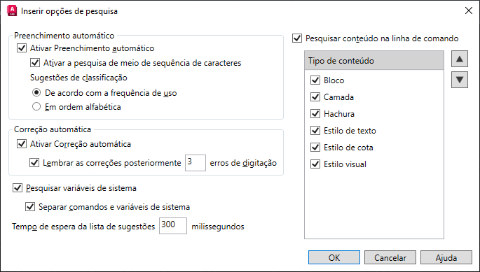 Controla as configurações para a exibição da lista de sugestões da linha de comando dos comandos, das variáveis de sistema e dos objetos nomeados