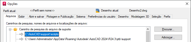 Nota: É possível gerenciar as pastas da configuração do Caminho de pesquisa do arquivo de suporte do AutoCAD na guia Arquivos da caixa de diálogo Opções (comando OPCOES). Para obter informações sobre como adicionar pastas à configuração Caminho de pesquisa do arquivo de suporte do AutoCAD, consulte Para modificar caminhos de pesquisa do arquivo de suporte.