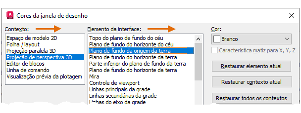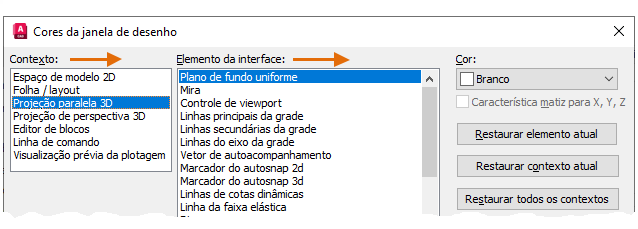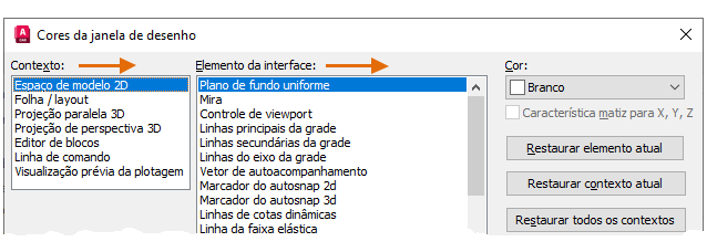 Nota: Para retornar rapidamente às configurações de cor padrão, abra a caixa de diálogo Cores da janela de desenho e clique em Restaurar todos os contextos no lado direito da caixa de diálogo Cores da janela de desenho.