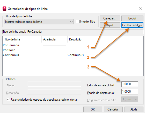1. Clique em Carregar. Selecione um ou mais tipos de linha que deseja utilizar. Observe que tipos de linha tracejados (não contínuos) vêm em vários tamanhos predefinidos.