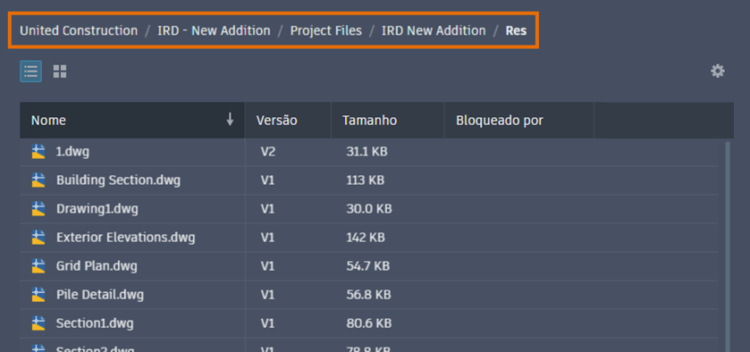- Acima da lista de desenhos do projeto, as trilhas de navegação são mostradas para o caminho do projeto atual.