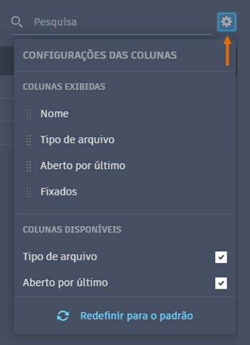 - Na vista em lista, é possível personalizar os cabeçalhos de coluna clicando em configurações. Nome e Fixado são colunas persistentes.