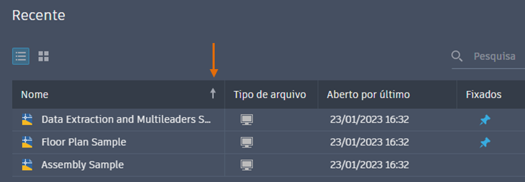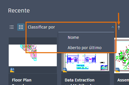 A lista de desenhos recentes usa miniaturas menores para permitir que mais desenhos sejam exibidos. Agora é possível classificar e pesquisar os desenhos recentes nas exibições em grade e lista.