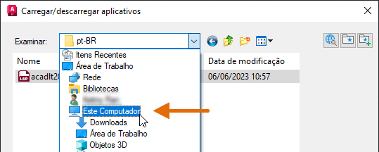 Agora que você criou o arquivo, em vez de usar a caixa de diálogo Carregar/descarregar aplicativo que é exibida com o comando CARRAPLIC, você carregará o arquivo LSP usando o Explorador de arquivos.