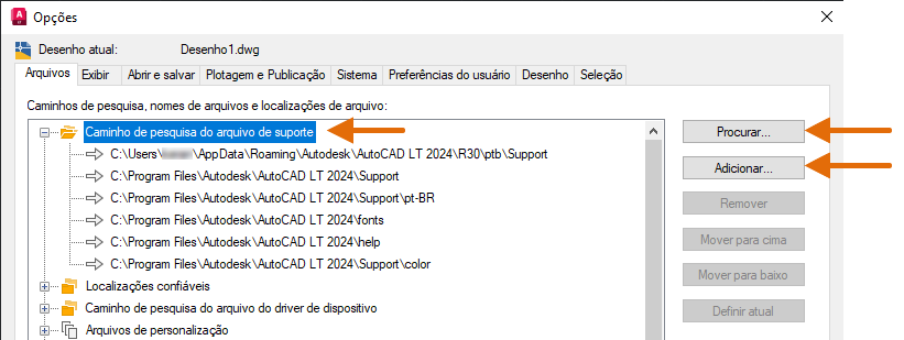 As pastas listadas são onde o AutoCAD LT procura os arquivos do AutoLISP, entre outros tipos de arquivos personalizados usados para armazenar padrões de hachura, tipos de linha, aliases de comando e definir novos elementos da interface do usuário.