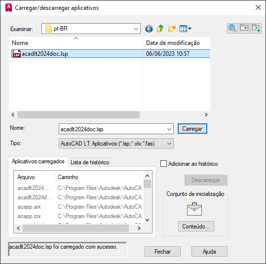 Na caixa de mensagem, “acadlt2024doc.lsp foi carregado com sucesso.” é exibido no canto inferior esquerdo da caixa de diálogo e na janela da linha de comando.
