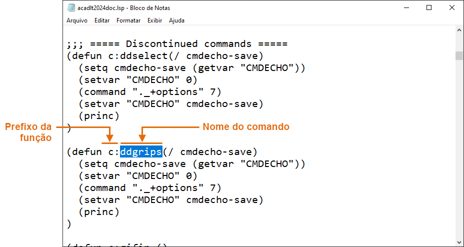 A imagem a seguir mostra parte do arquivo acadlt2024doc.lsp aberto no Bloco de notas. Os comandos definidos pelo AutoLISP que podem ser inseridos no prompt de comando são precedidos por c:. O texto diretamente após c: é o nome do comando.