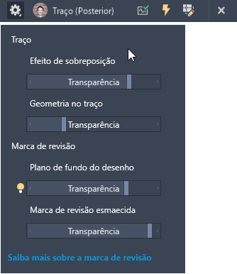 Marca de revisão esmaecida. Quando uma marca de revisão digital está ativa, controla a transparência das marcas de revisão esmaecidas. Quanto menor for o número, mais visível será a marca de revisão. O controle deslizante de Marca de revisão esmaecida modifica a variável de sistema TRACEMARKUPFADECTL.