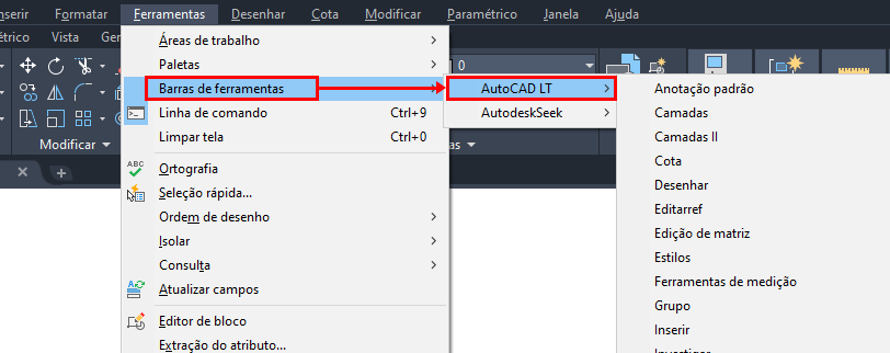 Nota: Certifique-se de ter um desenho aberto para que o menu Ferramentas seja incluído.