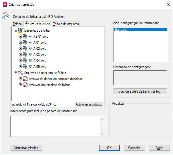 Por padrão, todos os arquivos associados ao desenho atual (como refex, estilos de plotagem e fontes relacionados) são apresentados. Você pode adicionar arquivos ao pacote de transmissão ou remover arquivos existentes. Os arquivos relacionados que são mencionados pelos URLs não são incluídos no pacote de transmissão.