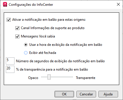 Controla a transparência da exibição dos balões de 0 (opaco) para 80 (quase transparente).