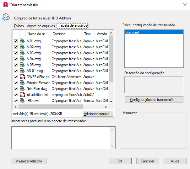 Por padrão, todos os arquivos associados ao desenho atual (como refex, estilos de plotagem e fontes relacionados) são apresentados. Você pode adicionar arquivos ao pacote de transmissão ou remover arquivos existentes. Os arquivos relacionados que são mencionados pelos URLs não são incluídos no pacote de transmissão.