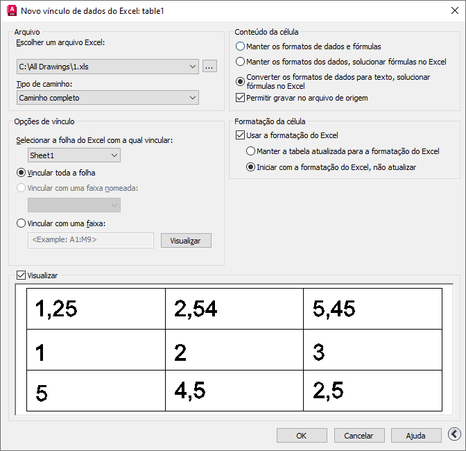 Vincula toda a folha especificada dentro de seu arquivo Excel com uma tabela em seu desenho.
