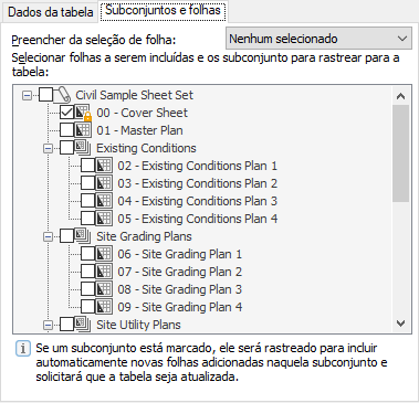 Exibe os subconjuntos de conjunto de folhas que devem ser automaticamente atualizados.