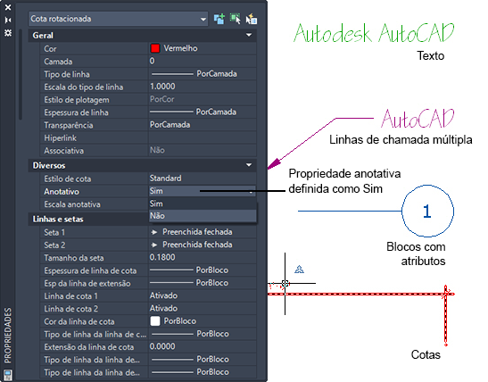 Os objetos de anotação incluem cotas, notas e outros tipos de símbolos ou objetos explanatórios normalmente usados para adicionar informações ao desenho.