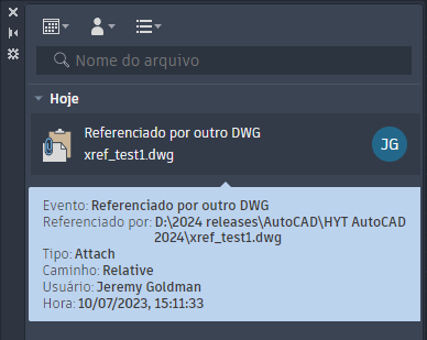 Passe o cursor sobre o evento Referenciado por outro DWG para ver seus detalhes.