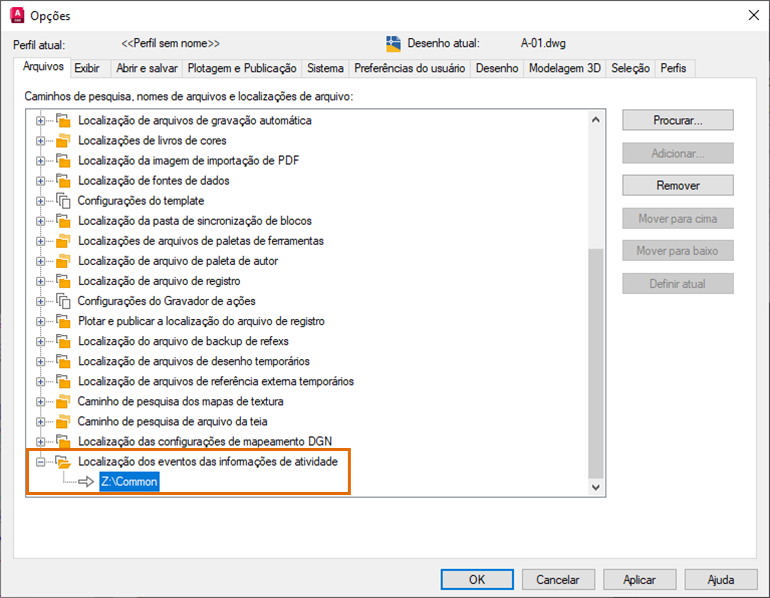 Depois que todos os colaboradores definirem a mesma localização para as Informações de atividade, todos os eventos de desenho serão gravados e lidos nessa localização.
