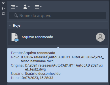Nesta seção, usaremos o Explorador de arquivos para renomear nosso arquivo xref_test2.dwg e ver que tipo de evento é exibido na paleta Informações de atividade.