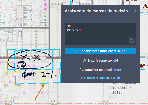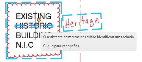 Com o Assistente de marcas de revisão, é possível agir nas marcas de revisão importadas. O Assistente de marcas de revisão pode identificar texto, texto riscado, linhas de chamada, nuvens de revisão, texto instrucional e comentários em PDF. Quando você age em uma marca de revisão, como inserir uma nuvem de revisão ou textoM, o objeto é adicionado ao desenho, não ao traço.