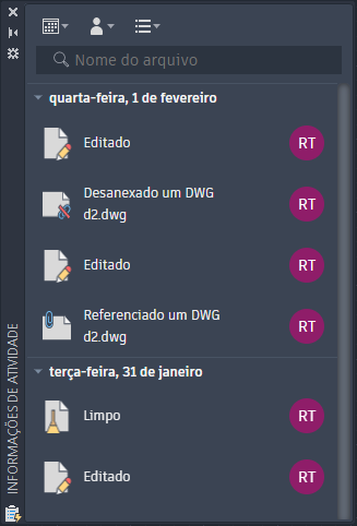 As Informações de atividade rastreiam eventos sempre que um arquivo de desenho é aberto e está sendo trabalhado no AutoCAD. Elas também podem rastrear alguns eventos fora do AutoCAD, como renomear ou copiar um desenho no Windows Explorer. Quando um desenho é aberto, os eventos passados executados no desenho são lidos do banco de dados das Informações de atividade e exibidos cronologicamente na paleta Informações de atividade. Ao mesmo tempo, os eventos estão sendo gravados no banco de dados enquanto você trabalha no desenho, o que mantém o conteúdo da paleta atual.