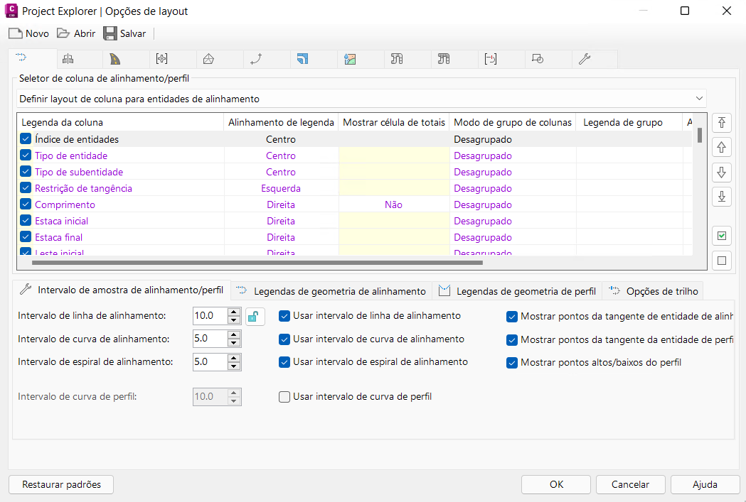 - Altere a lista suspensa na guia Alinhamentos para Configurar o layout da coluna para Entidades/pontos de alinhamento .
