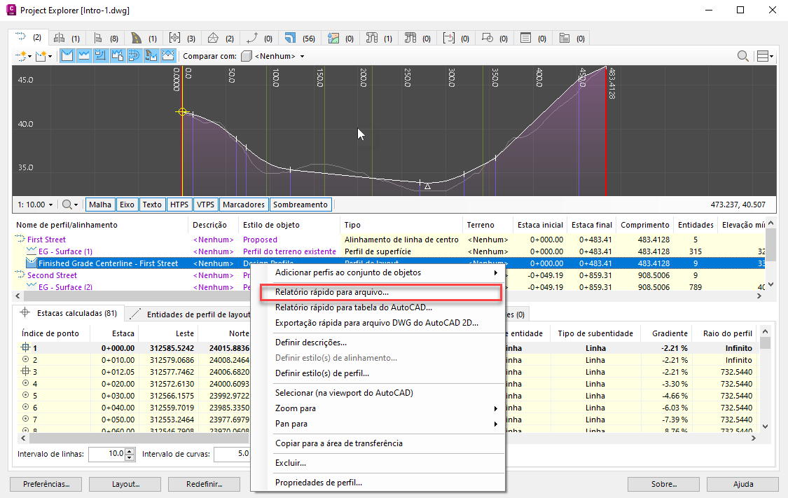 Este tutorial demonstra o uso do Project Explorer para gerar um relatório simples de Alinhamento/perfil do Civil 3D para um arquivo PDF. Em seguida, você gravará o mesmo relatório em um arquivo XLSX do Excel.